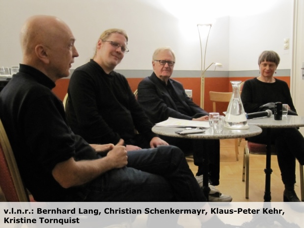 Mit Klaus-Peter Kehr, Bernhard Lang, Kristine Tornquist, moderiert von Christian Schenkermayr, Video-Statement von Johannes Maria Staud